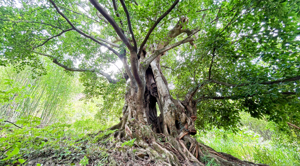 古樹資源也是海花溝的一大特色。項目范圍內(nèi)有近200棵數(shù)百上千年的古樹沿主要道路呈帶狀分布,專家一行參觀的是園區(qū)的“千手觀音子母樹”和“七星古樹”。子母樹為同根而生的雙生樹,母樹根系在十余米外再次萌芽,生長為子樹。二者根系相連、枝葉相接、風姿相似,因母樹枝干如手臂向四周伸展,神似千手觀音,故被當?shù)卮迕穹Q為“千手觀音子母樹”。“七星古樹”因生長方位分別與北斗七星——天樞、天璇、天璣、天權(quán)、玉衡、開陽、瑤光對應(yīng),故此得名。每年農(nóng)歷三月三,七里八鄉(xiāng)的村民在此舉行“斗菜節(jié)”,祭祀樹神祈福新年。